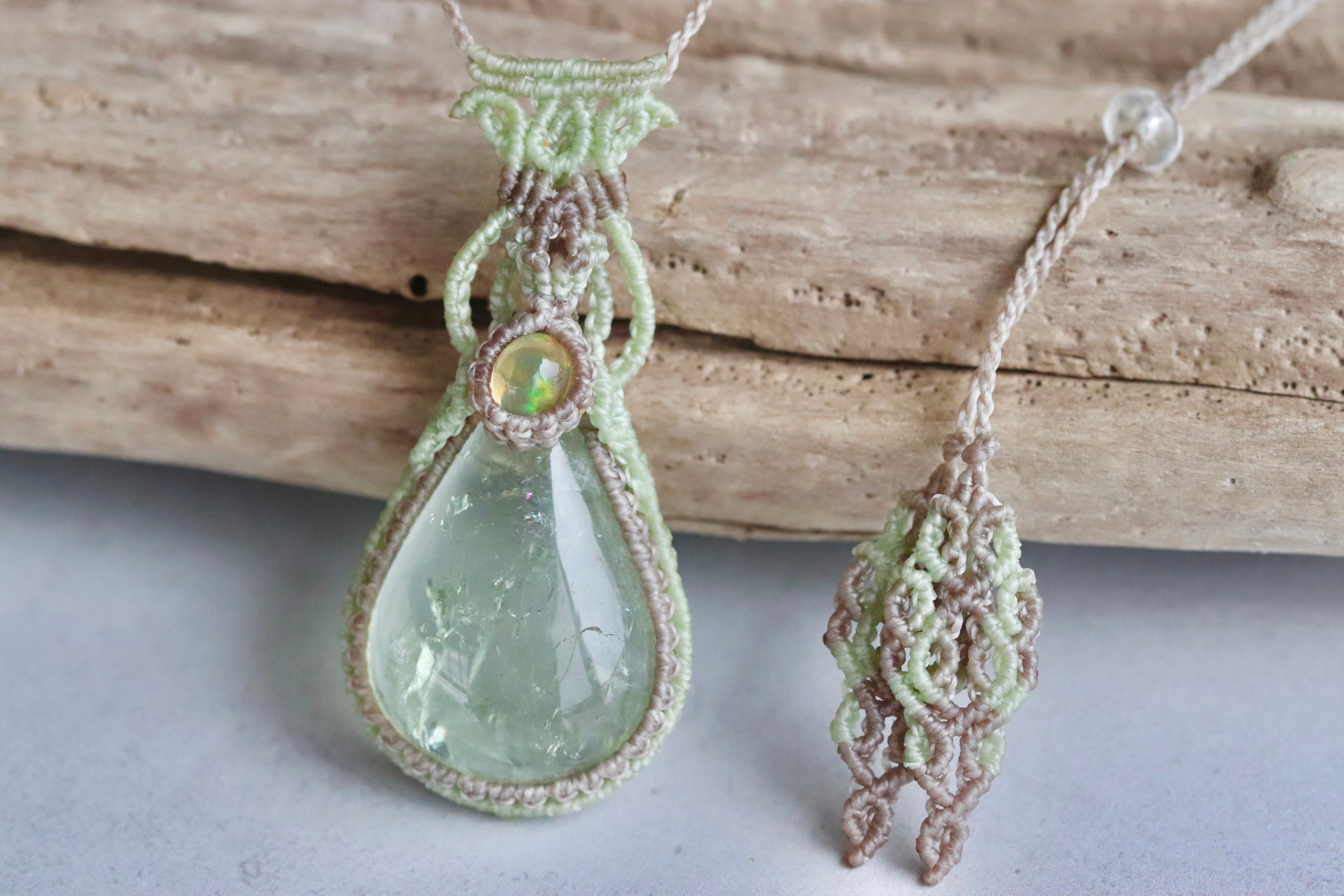 小粒ながらとっておきの輝き、遊色を見せてくれるプレシャスオパールと重ね合わせ、ミントグリーンと明るいグレーのコードを組み合わせ、上品な印象で仕上げました。