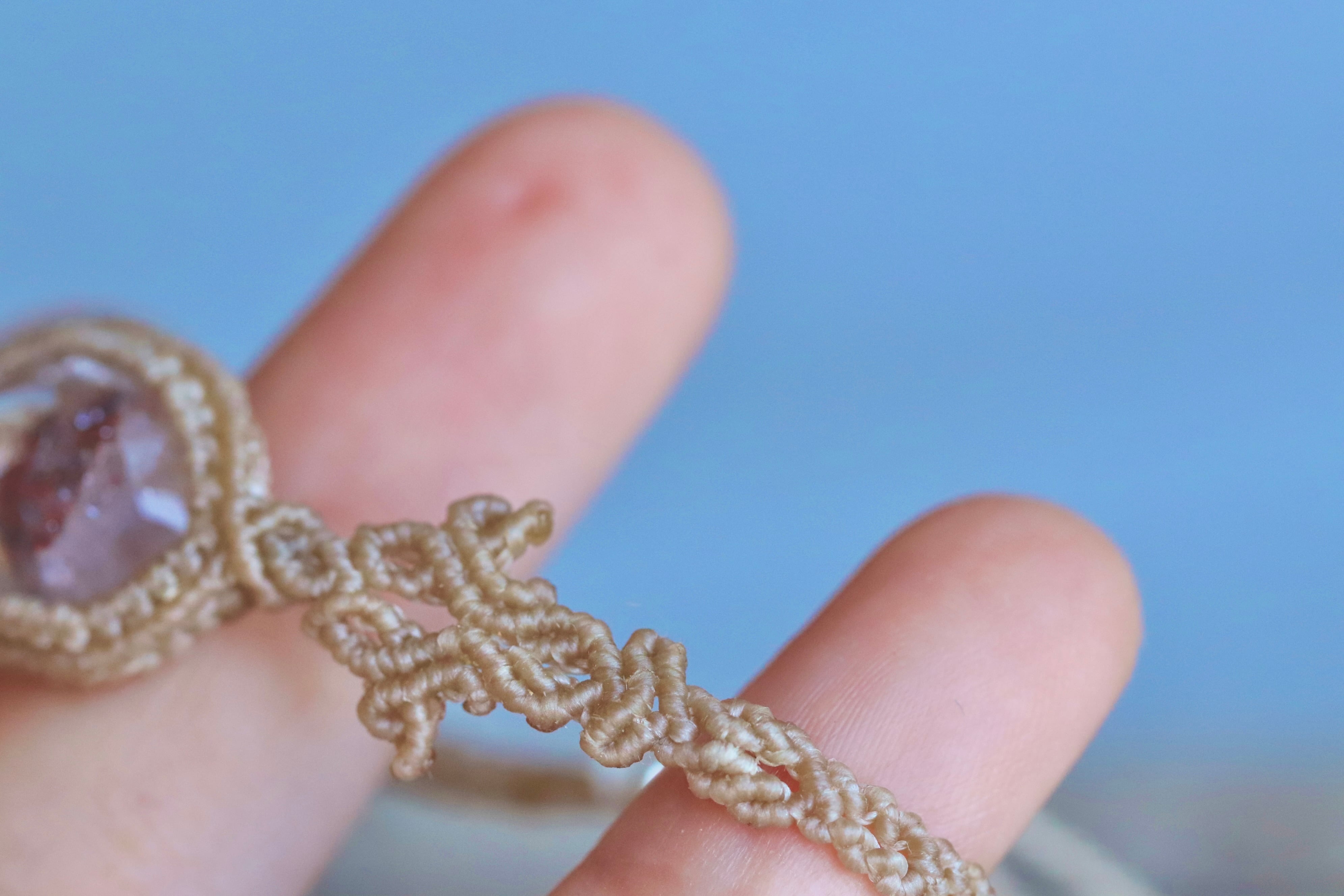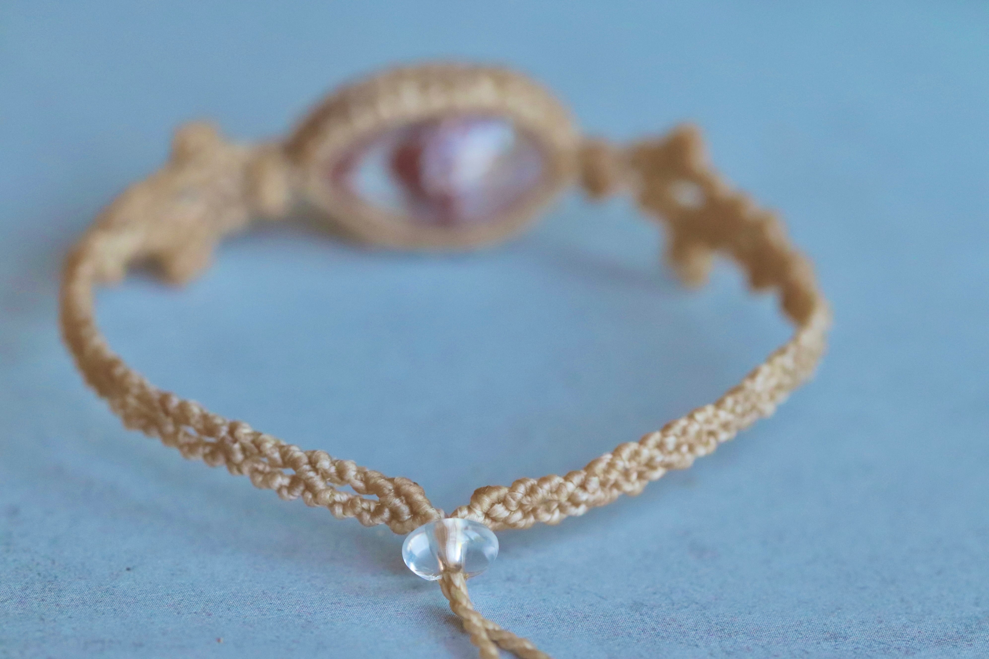 最大26センチまで開くことのできる長さ調整用の水晶ビーズをスライドする事で手首にフィットするように作っています。