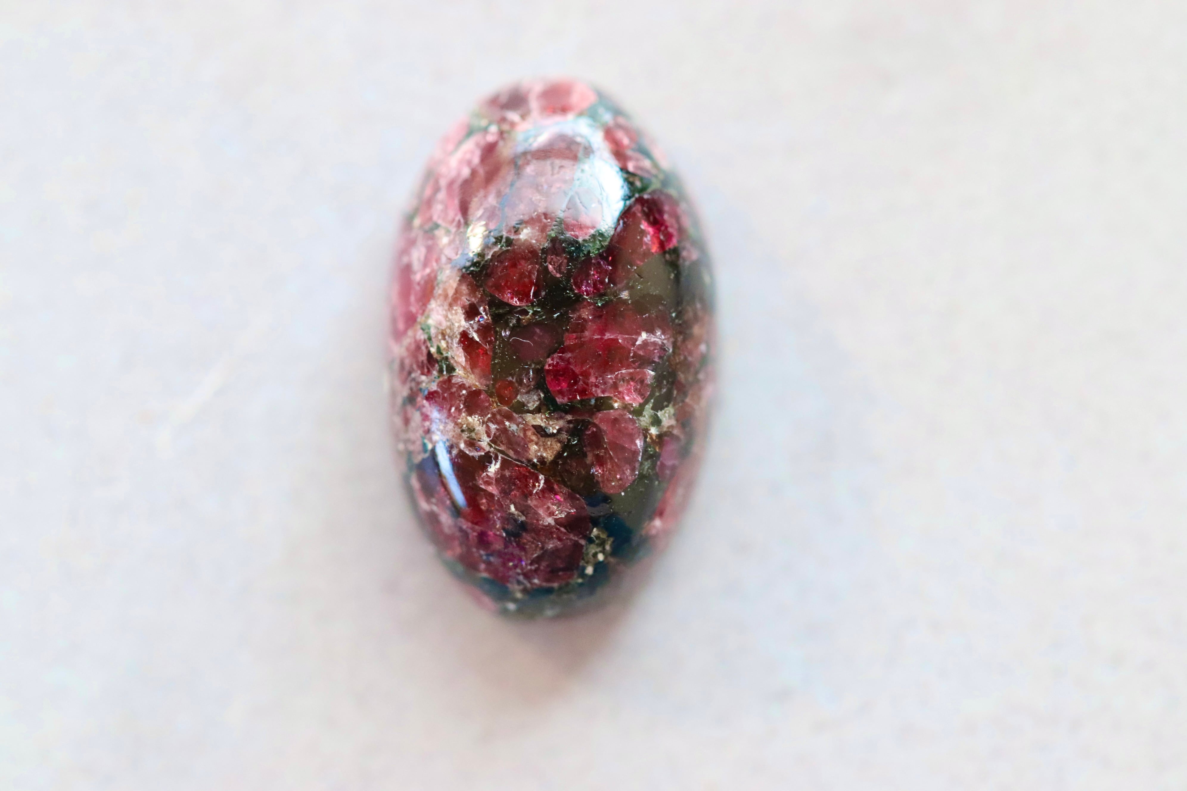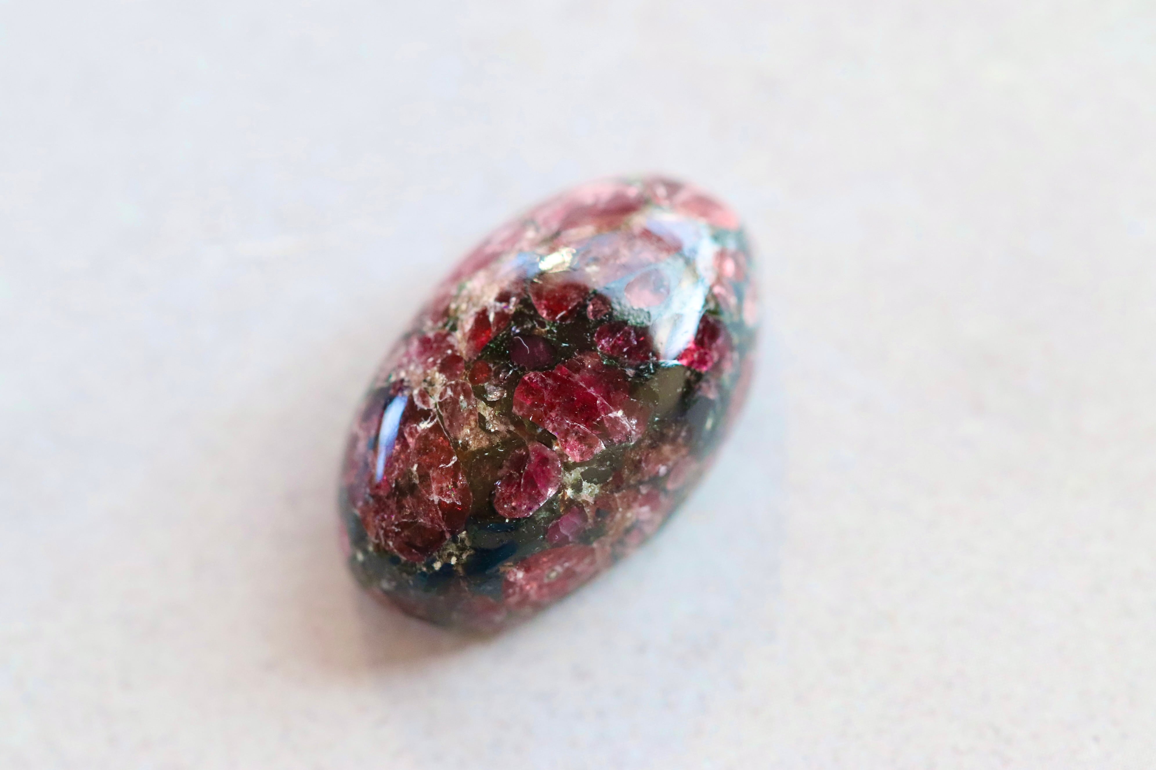 ステンドグラスのように黒地の母岩に広がる輝くワインレッドのユーディアライト。