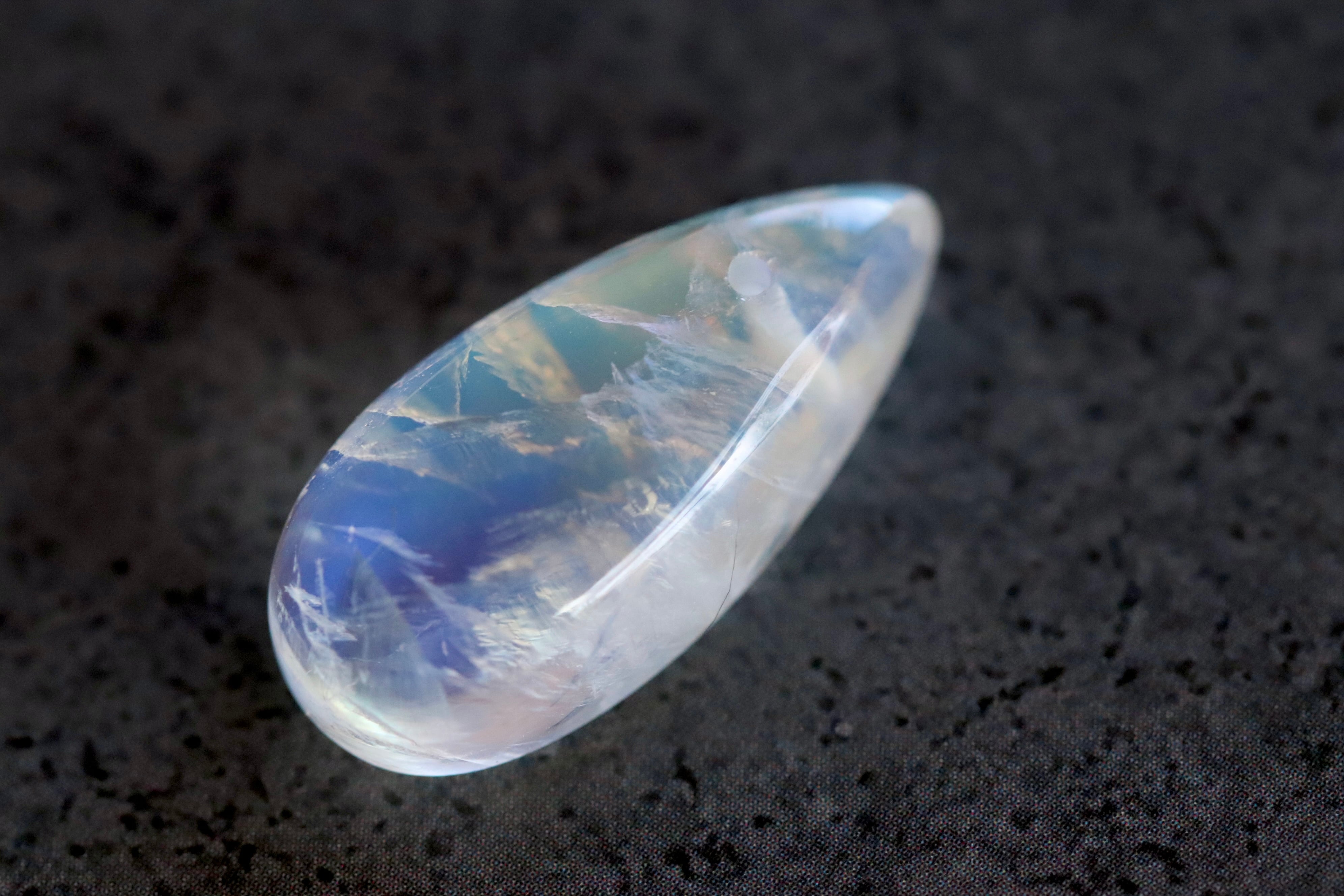 満月の光の様な透き通る白い光の中に漂う美しい青いシラーが本当に神秘的な一点です。