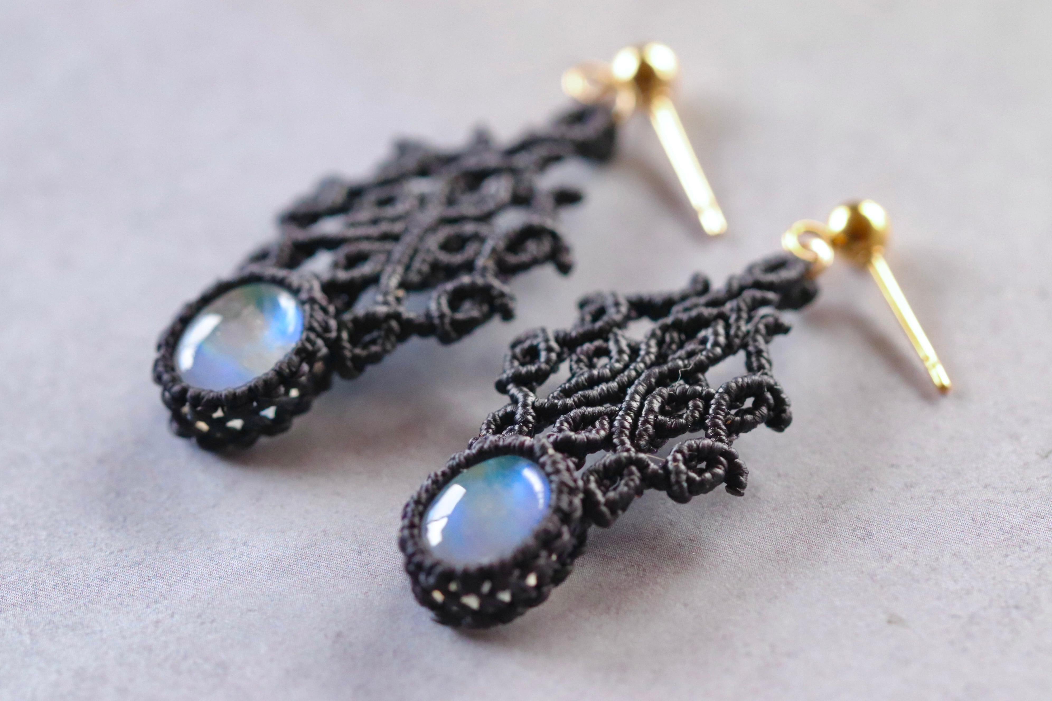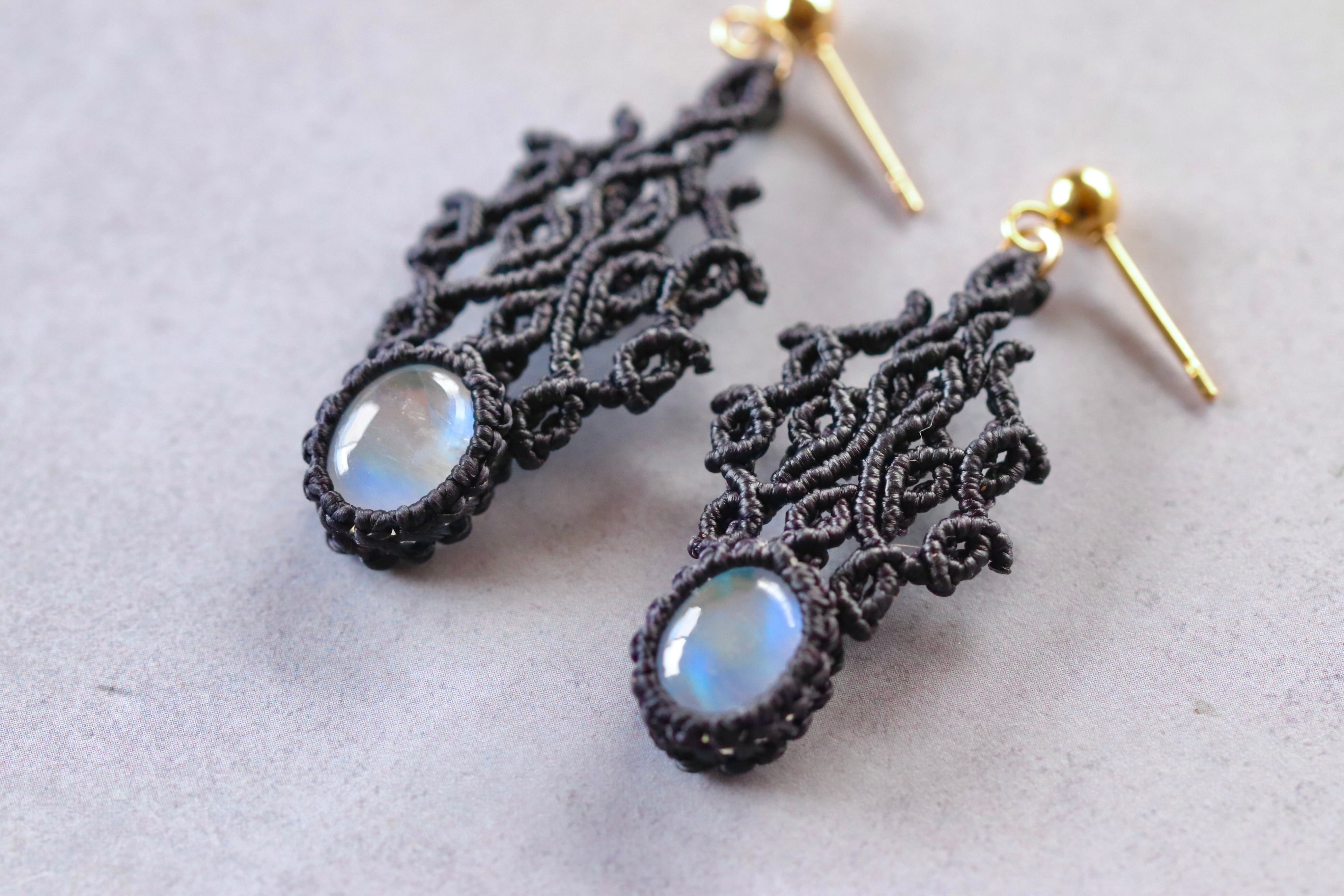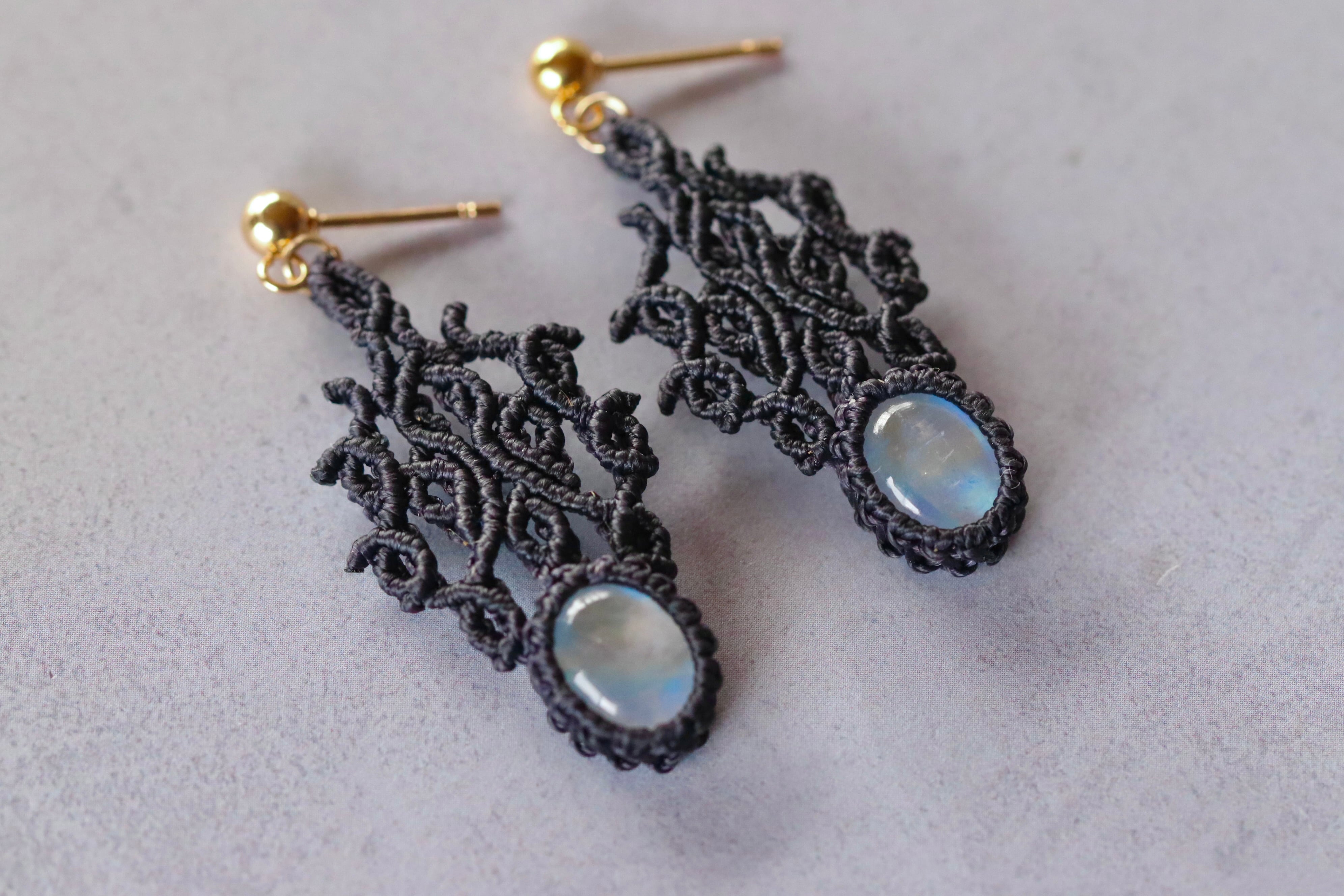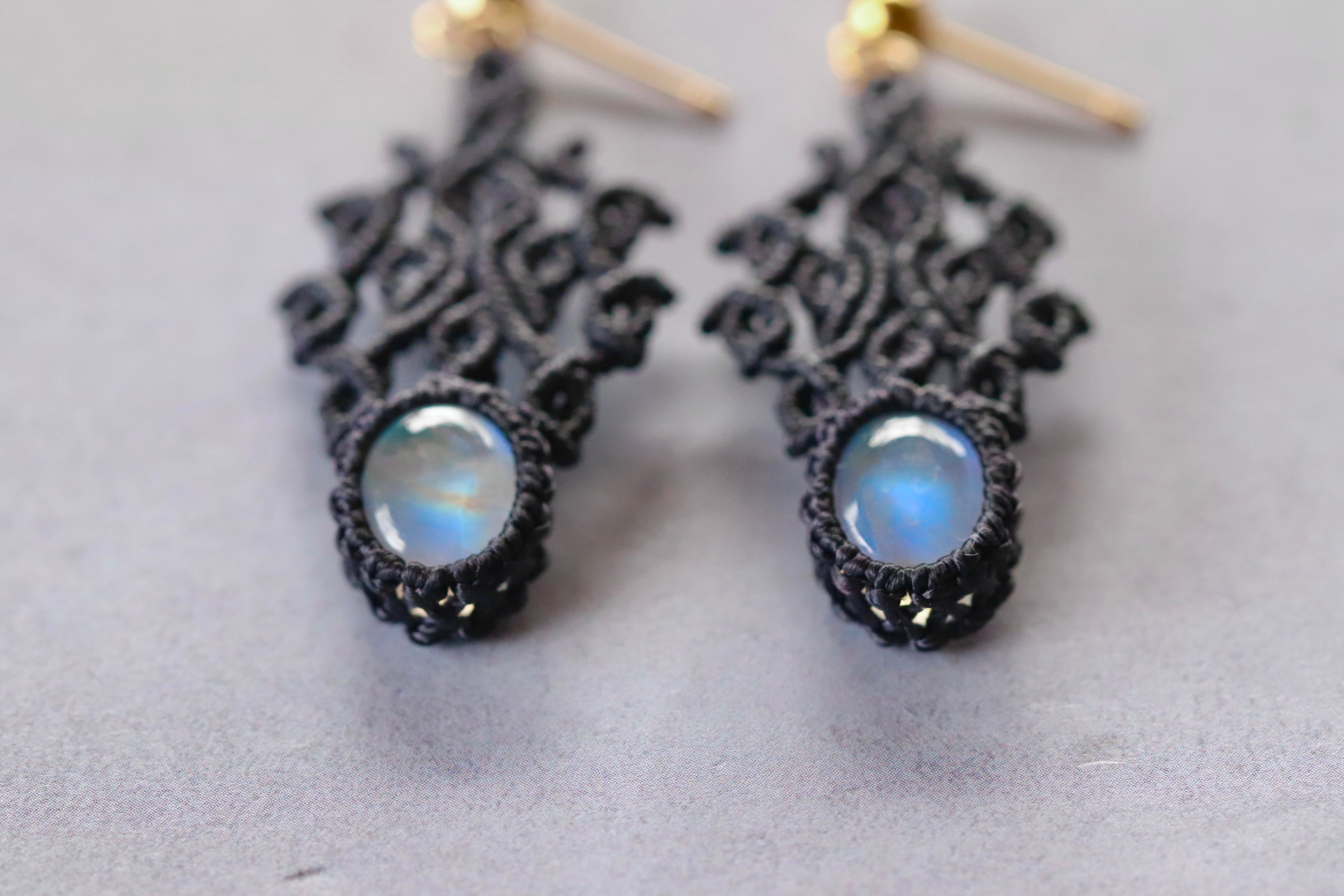 青い閃光の美しい小粒のムーンストーンに細かな模様編みで華やかな印象に仕立てました。