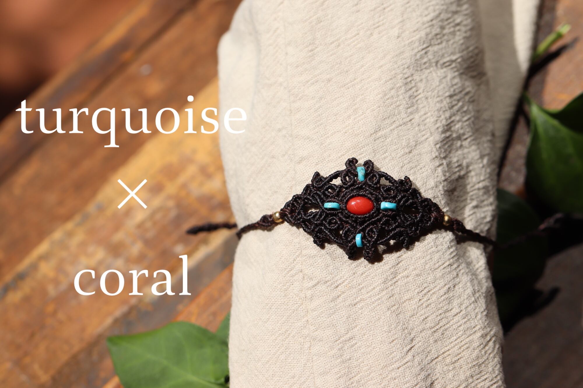 イタリア産の美しい紅色のコーラルと、キングマンターコイズを組み合わせたインディアンジュエリースタイルのマクラメブレスレットです。