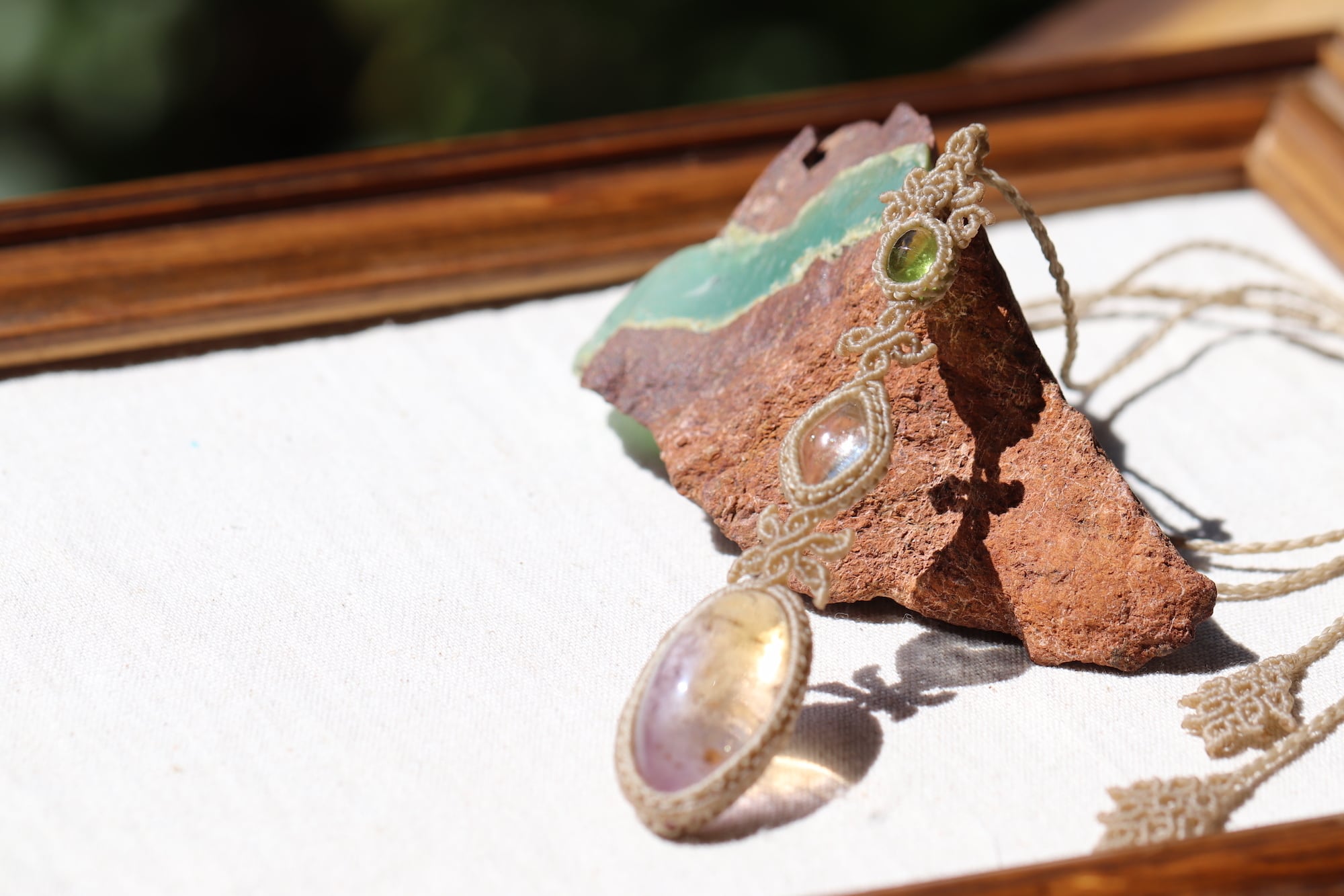 潤い溢れる艶やかで瑞々しいペリドット、スキャポライト、大粒のアメトリンを使用しました。