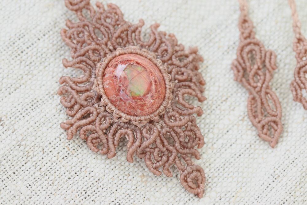 艶やかに磨かれた赤土のような母岩の中で様々な美しい色が泳ぐカンテラオパールを使用しました。