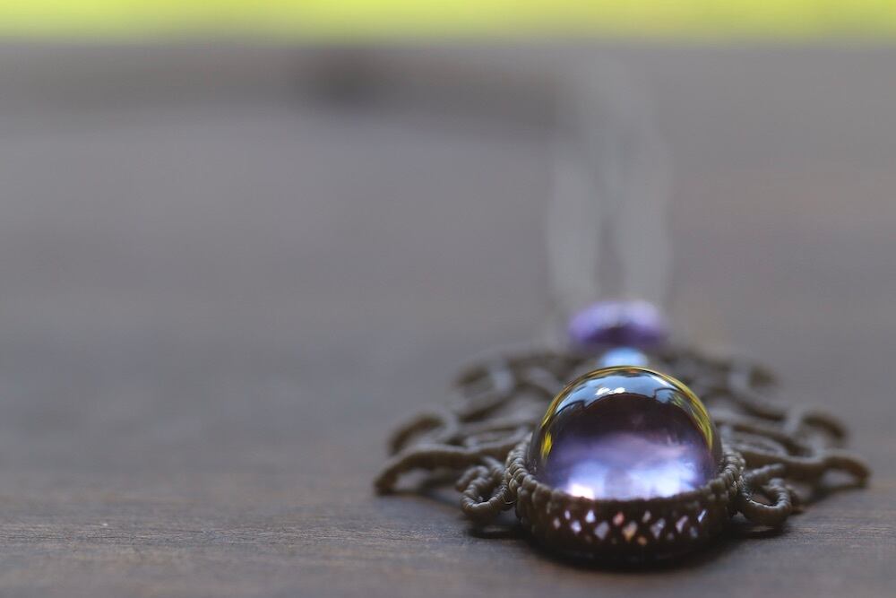 着用時、自分の目線からも周りからも青い閃光と大粒のアメシストが目を引く女性らしさを引き立てるデザインのペンダントです。