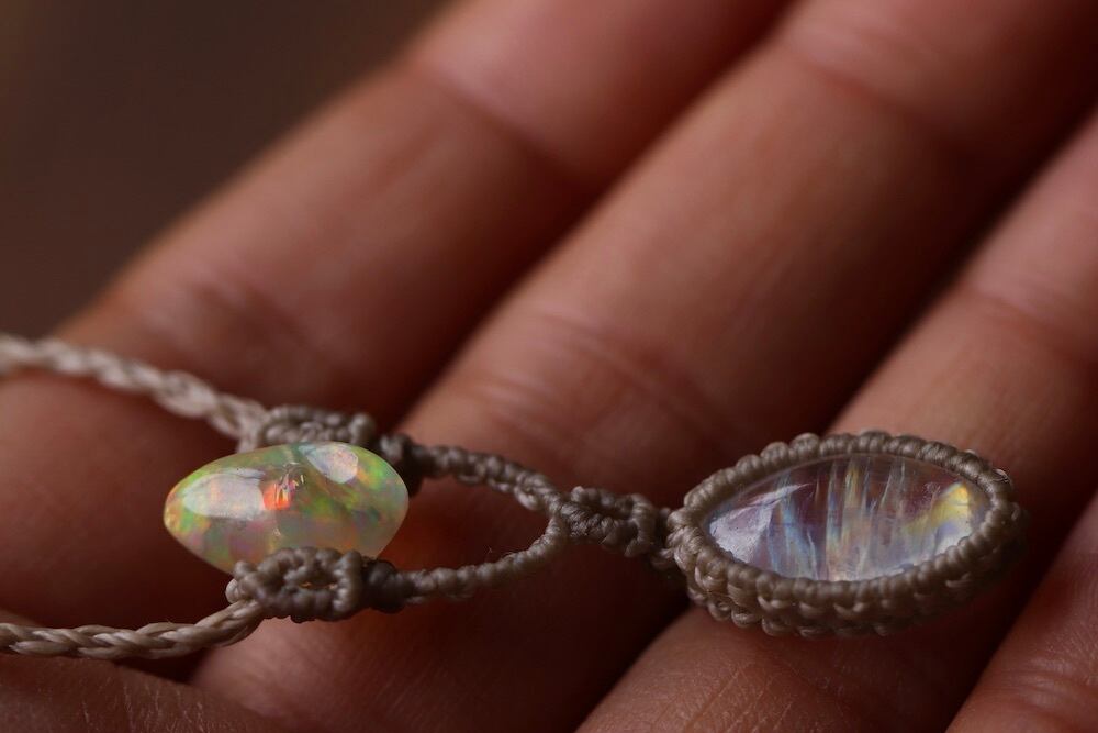 光る命の種をイメージしてデザインしたこちらの作品は、メキシコ産の上質なプレシャスオパールと、美しい閃光のムーンストーンをを使用しました。