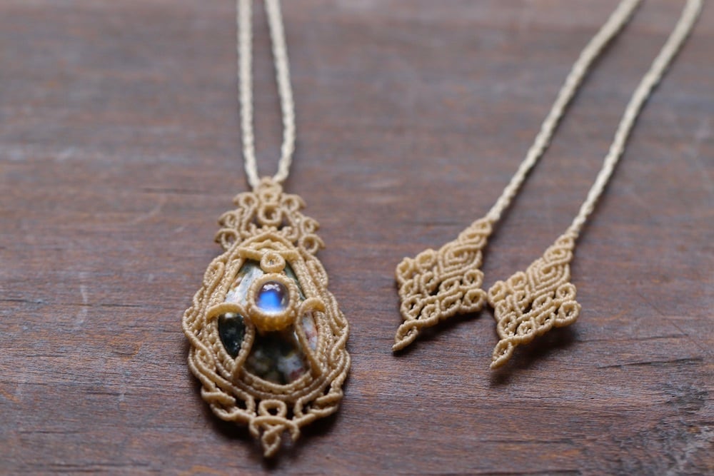 【母なる海の女神様】をイメージしてデザインしたこちらの作品は、Maktubで研磨したマダガスカル産のオーシャンジャスパー、そしてその上で青い閃光を放ち続けるムーンストーンを使用しました。
