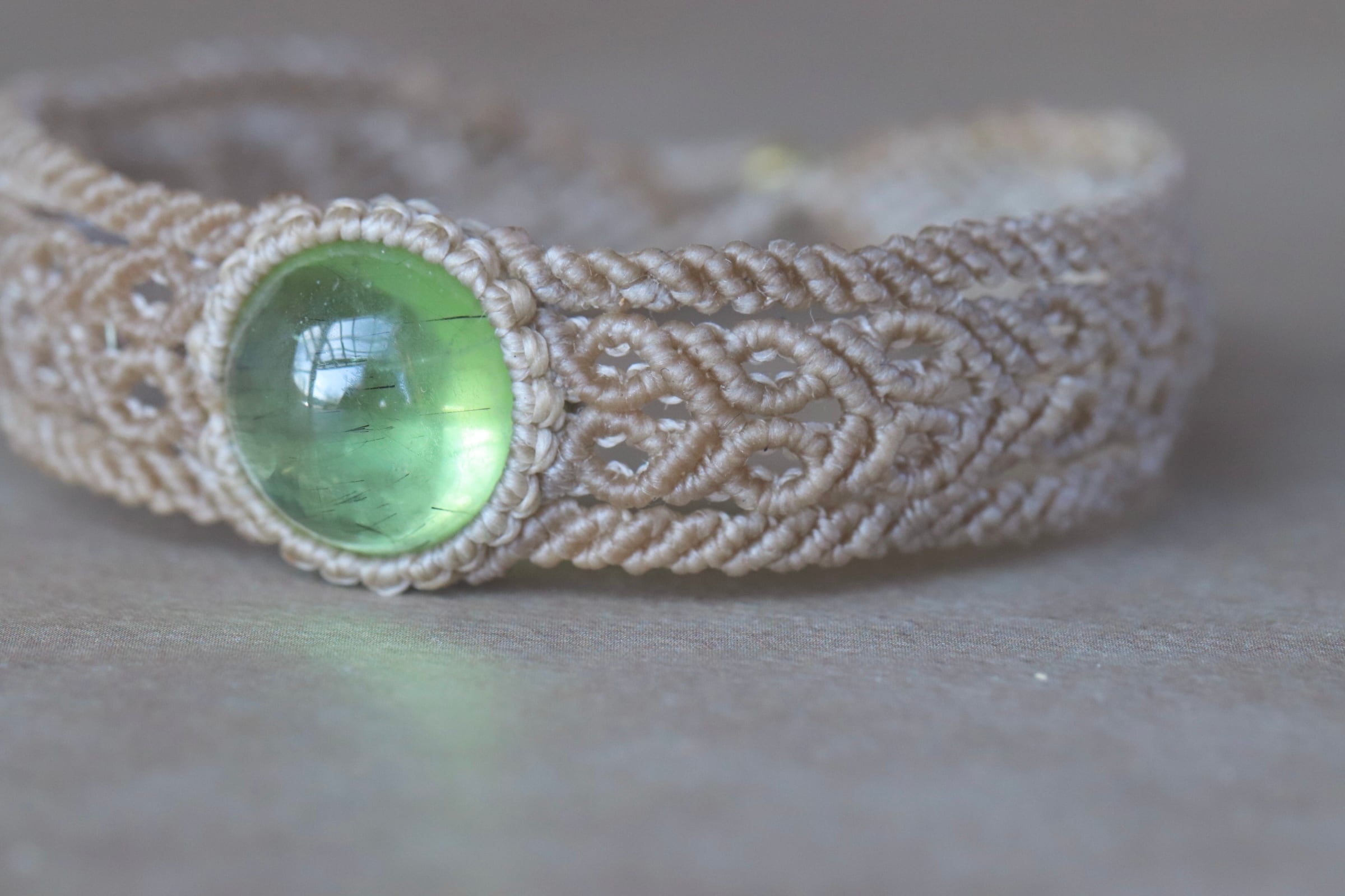 マクラメ編みの基本であり伝統的な装飾模様を組み合わせ、肌馴染みの良い色合いのワックスコードを使用し、丁寧に時間をかけて編みました。